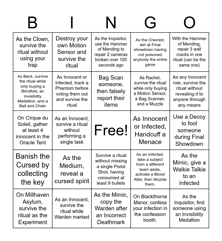 This bingo card has a free space and 158 words: Win a Final Showdown in reality without handcuffs, As an Infected, do not kill anyone in reality during the Final Showdown, As an Infected, survive the ritual having never executed, As the Vampire, survive the ritual without sending a single bat, As the Vampire, survive the ritual while only being flashed 5 or less times, As the Vampire, survive the ritual after executing at least 3 subjects, As the Experiment, survive the ritual without using your Light Block, As the Experiment, survive the ritual while only sprinting once per Inbetween, As the Experiment, survive the ritual without executing a single subject, As the Werewolf, survive the ritual while never sprinting, As the Werewolf, survive the ritual while ONLY sprinting while transformed (you get exceptions, just don’t be too liberal), As the Werewolf, survive the ritual while never howling, As the Clown, survive the ritual without using your trap, As the Clown, survive the ritual without Going Bananas, As the Medium, reveal a cursed spirit, As the Medium, reveal an infected spirit, As the Medium, reveal 3 Innocent Spirits in one ritual, Two Tap someone (two HEADSHOTS), As the Mimic, survive the ritual, As the Soulbound, survive the ritual, As the Soulbound, bind an infected, As the Soulbound, soulstrike an infected, As the Soulbound, soulstrike before 3 people are banished from the ritual (at 9, 8, or 7), As the Chemist, survive the ritual, As the Chemist, successfully frame somebody, As the Chemist, poison everybody while only beginning to poison at 5, As the Chemist, win at Final showdown having not poisoned anybody the entire game, As the Phantom, survive the ritual, As the Phantom, frame an Innocent and get them banished, As the Phantom, apply ⅘ hindering items to a single subject simultaneously in a ritual (Blindfold, Earmuffs. muzzle, Ball and Chain, Cuffs), As the Phantom, waste/disrupt the informational tool on the map, As the Purifier, purify 3 altars in one reality phase, As the Guardian, successfully protect three people in one match, As the Guardian, protect someone without telling them in the previous reality, As a Human, survive a ritual without claiming your role, As a Human, survive the ritual without buying any light items, As a Human, survive the ritual without ever voting, As the Warden, Deathmark and banish correctly without buying the pistol or knuckle dusters, Banish the Cursed by collecting the key, As an Innocent, eliminate an Infected before the first Inbetween, As the Inquisitor, find someone using an Invisibility Medallion, As the Inquisitor, catch and down an infected running from an activated blood altar (does not have to be you who downs), As the Inquisitor, survive the ritual while only activating your ability once per reality, As an Innocent, get Guarded while wearing a mask of someone else., As an Infected, get Guarded, As the Cursed, get Guarded, As an Infected, win without activating a single blood altar yourself(includes leak), As the Mimic, catch an Infected bluffing their role and announce it to the Innocent, As the Mimic, copy a role and end the ritual, As the Mimic, survive the ritual after copying the role of the first voted out subject, As the Mimic, give a Walkie Talkie to an Infected, As the Mimic, copy the Warden after an Incorrect Deathmark, As an Infected, win while only purchasing light items, Down 2 people with one Gas Grenade (includes yourself), Convince someone to throw a Smoke Grenade with you, As an Infected, take a subject from a different team aside, activate a Blood Alter, then Muzzle them., As an Innocent, survive a ritual without portaling once, On Cirque du Soleil, as an Innocent, pick the worst question in the Oracle Tent and survive the ritual, On Cirque du Soleil, feed each of the animals at least once in a single ritual. (there are 4), On Cirque du Soleil, repair 4 rides total in a single ritual (sabotage will allow extra repairs), On Cirque du Soleil, gather at least 4 innocent in the Oracle Tent, With the Hammer of Mending, break and repair 5 cameras in one ritual, With the Hammer of Mending, repair 3 wall cracks in one ritual (can be the same one), With the Heat Goggles, call out a player from another team and get them downed without dealing any damage yourself, On Millhaven Asylum, use the inspection table to scan someone on a different team, Survive a ritual without missing a single Pistol Shot, having consumed at least 9 bullets, As an Innocent, survive the ritual while Warden marked, As the Warden, mark an innocent and survive the ritual, As an Innocent, open 2 doors and escape the ritual, As an Infected, convince an innocent to grab key in front of you, As an Infected, successfully bluff a role you do not have throughout a ritual, On Blackthorne Manor, survive the ritual without using a single secret passage, On Blackthorne Manor, condemn someone in booth, On Blackthorne Manor, confess your infection in the confession booth., On Blackthorne Manor, confess your curse in the confession booth., On Project Wurgen, coerce someone into tubes who is on a different team, On Project Wurgen, survive the ritual without using stairs, On Project Wurgen, survive the ritual after solving ⅔ picture puzzles, On Millhaven Asylum, survive the ritual after solving ⅔ picture puzzles, On Millhaven Asylum, survive the ritual as the Experiment, On Project Wurgen, survive the ritual as the Werewolf, On Blackthorne Manor, survive the ritual as the Vampire, On Cirque du Soleil, survive the ritual as the Clown, As the Cursed, sabotage the ritual during the first reality without being discovered by the second reality, As Alex, survive the ritual while only buying a Camera, Torch and a Walkie Talkie, As Lisa, survive the ritual while only buying a Pistol and Handcuffs, As Chang, survive the ritual while only buying Knuckle Dusters, Adrenaline, and a Flare, As Rachel, survive the ritual while only buying a Motion Sensor, a Bag Scanner, 