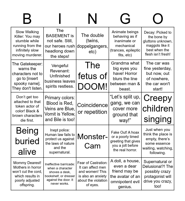 This bingo card has 25 words: Inept police: Human law fails to protect us against the laws of nature and the supernatural., Fear of Castration: It can affect men and women! This is also an anxiety about the violation of eyes., The fetus of DOOM!, Mommy Dearest! Mothers in horror won’t cut the cord, which results in poorly adjusted offspring., Decay: Picked to the bone by gluttons unknown, maggots like it best when the flesh isn’t fresh!, Slow Walking Killer: You may stumble while running from the infinitely slow moving murderer., The Gatekeeper: warns the characters not to go to [insert spooky name]. They don't listen., The BASEMENT is not safe. Still, our heroes rush headlong down the steps!, “Let’s split up, gang, we can cover more ground that way!”, Monster-Cam, Grandma what big eyes you have! Horror blurs the line between man & beast., Don’t get too attached to that token actor of color! Black & brown characters die first., Fake Out! A hoax or a poorly timed greeting that gives you a jolt before the real horror., Just when you think the place is empty, there’s some essence waiting, watching, following., Vengeful Revenant: Unfinished business leaves spirits restless., Supernatural or Delusional?! The possibly crazy protagonist will drive you crazy, too!, Creepy children singing, The double (twins, doppelgangers, etc), The car was fine yesterday, but now, out of nowhere, the car won't start!, Primary colors: Blood is Red, Veins are Blue, Vomit is Yellow, and Bile is too!, Coincidence or repetition, Ineffective barricade: when a character shoves a desk, bookshelf, or dresser against the door. It never works., Being buried alive, Animate beings behaving as if inanimate or mechanical (trances, epileptic fits, etc) and A doll, a house, even a dear friend may be the avatar of an omnipotent evil genius..