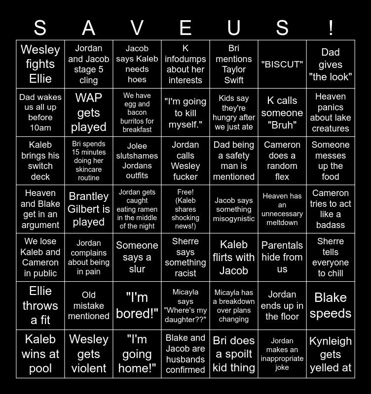 This bingo card has a free space and 48 words: Micayla has a breakdown over plans changing, K calls someone "Bruh", Blake and Jacob are husbands confirmed, Brantley Gilbert is played, Jolee slutshames Jordans outfits, Cameron tries to act like a badass, Jordan and Jacob stage 5 cling, Wesley gets violent, "BISCUT", Sherre says something racist, Dad gives "the look", K infodumps about her interests, Cameron does a random flex, Dad being a safety man is mentioned, Ellie throws a fit, Heaven has an unnecessary meltdown, Dad wakes us all up before 10am, Heaven panics about lake creatures, Jordan ends up in the floor, Bri mentions Taylor Swift, Kids say they're hungry after we just ate, Jordan gets caught eating ramen in the middle of the night, Wesley fights Ellie, WAP gets played, Blake speeds, We have egg and bacon burritos for breakfast, Someone messes up the food, Kaleb wins at pool, Jordan calls Wesley fucker, Bri spends 15 minutes doing her skincare routine, Jordan makes an inappropriate joke, Jacob says something misogynistic, Sherre tells everyone to chill, Old mistake mentioned, Heaven and Blake get in an argument, Kaleb flirts with Jacob, Parentals hide from us, Kaleb brings his switch deck, Someone says a slur, "I'm bored!", We lose Kaleb and Cameron in public, Kynleigh gets yelled at, Jacob says Kaleb needs hoes, "I'm going home!", "I'm going to kill myself.", Micayla says "Where's my daughter??", Jordan complains about being in pain and Bri does a spoilt kid thing.
