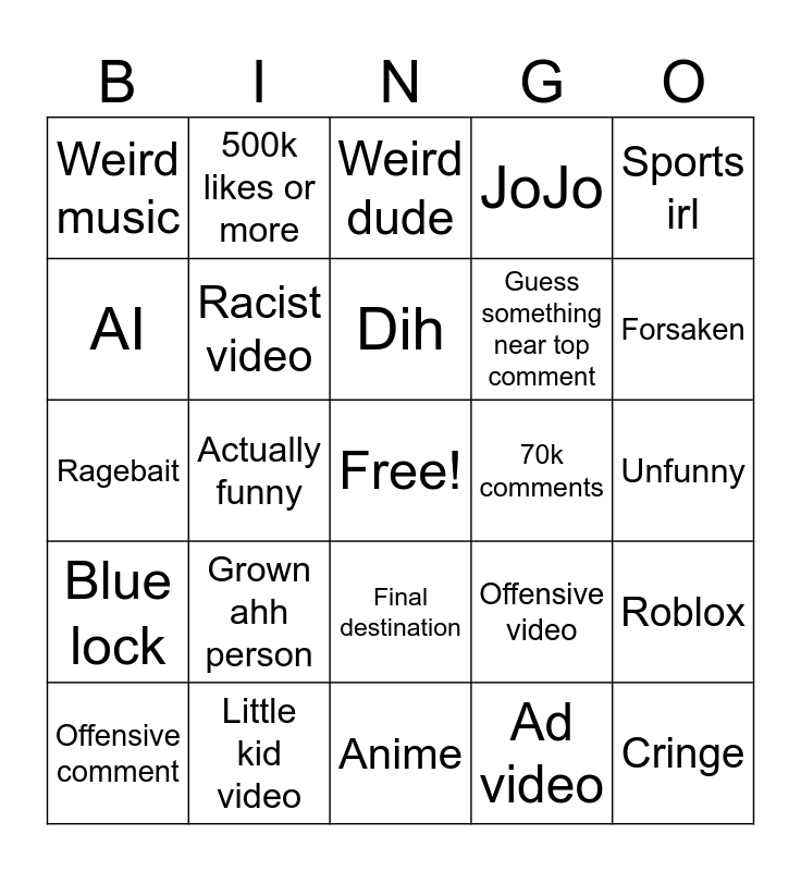 This bingo card has a free space and 24 words: Offensive comment, Grown ahh person, Dih, Ad video, Sports irl, Weird music, 500k likes or more, Weird dude, 70k comments, Unfunny, Ragebait, Racist video, Offensive video, Roblox, AI, Little kid video, Anime, JoJo, Forsaken, Blue lock, Actually funny, Final destination, Guess something near top comment and Cringe.