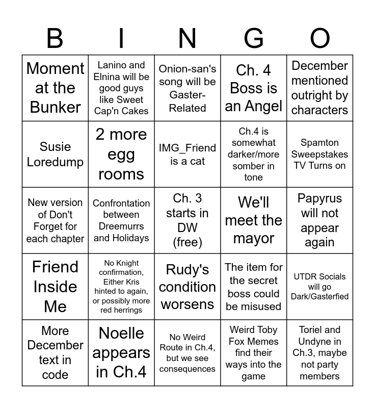 This bingo card has a free space and 24 words: No Knight confirmation, Either Kris hinted to again, or possibly more red herrings, Noelle appears in Ch.4, IMG_Friend is a cat, More December text in code, December mentioned outright by characters, Moment at the Bunker, Susie Loredump, Lanino and Elnina will be good guys like Sweet Cap'n Cakes, We'll meet the mayor, Rudy's condition worsens, Ch.4 is somewhat darker/more somber in tone, New version of Don't Forget for each chapter, The item for the secret boss could be misused, UTDR Socials will go Dark/Gasterfied, 2 more egg rooms, Weird Toby Fox Memes find their ways into the game, Papyrus will not appear again, Onion-san's song will be Gaster-Related, Spamton Sweepstakes TV Turns on, Confrontation between Dreemurrs and Holidays, Toriel and Undyne in Ch.3, maybe not party members, Friend Inside Me, Ch. 4 Boss is an Angel and No Weird Route in Ch.4, but we see consequences.