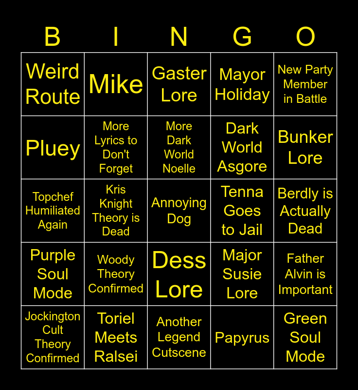 This bingo card has a free space and 24 words: Woody Theory Confirmed, Toriel Meets Ralsei, More Dark World Noelle, Jockington Cult Theory Confirmed, New Party Member in Battle, Weird Route, Pluey, Mike, Tenna Goes to Jail, Dess Lore, Dark World Asgore, Topchef Humiliated Again, Major Susie Lore, Father Alvin is Important, More Lyrics to Don't Forget, Papyrus, Berdly is Actually Dead, Gaster Lore, Bunker Lore, Kris Knight Theory is Dead, Green Soul Mode, Purple Soul Mode, Mayor Holiday and Another Legend Cutscene.