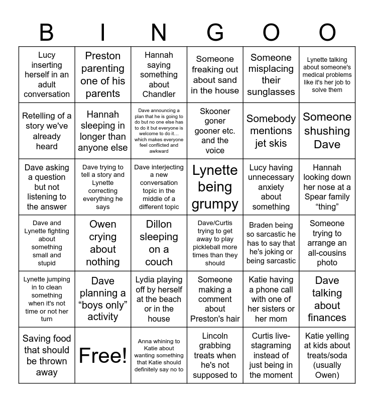 This bingo card has 39 words: Free!, Saving food that should be thrown away, Dave going out for food/drink randomly, Retelling of a story we've already heard, Dillon sleeping on a couch, Hannah looking down her nose at a Spear family “thing”, Hannah sleeping in longer than anyone else, Katie yelling at kids about treats/soda (usually Owen), Someone misplacing their sunglasses, Lynette being grumpy, Someone shushing Dave, Someone freaking out about sand in the house, Dave asking a question but not listening to the answer, Dave interjecting a new conversation topic in the middle of a different topic, Dave trying to tell a story and Lynette correcting everything he says, Lucy having unnecessary anxiety about something, Katie having a phone call with one of her sisters or her mom, Lucy inserting herself in an adult conversation, Anna whining to Katie about wanting something that Katie should definitely say no to, Dave and Lynette fighting about something small and stupid, Lynette talking about someone's medical problems like it's her job to solve them, Braden being so sarcastic he has to say that he's joking or being sarcastic, Dave announcing a plan that he is going to do but no one else has to do it but everyone is welcome to do it…which makes everyone feel conflicted and awkward, Skooner goner gooner etc. and the voice, Lincoln grabbing treats when he's not supposed to, Lydia playing off by herself at the beach or in the house, Lynette jumping in to clean something when it's not time or not her turn, Curtis live-stagraming instead of just being in the moment, Dave planning a “boys only” activity, Preston parenting one of his parents, Lucy holding Eloise even though she obviously wants to be put down, Dave talking about finances, Hannah saying something about Chandler, Dave/Curtis trying to get away to play pickleball more times than they should, Someone trying to arrange an all-cousins photo, Someone making a comment about Preston's hair, Owen crying about nothing, Somebody mentions jet skis and Dave blames a fart on a barking spider.