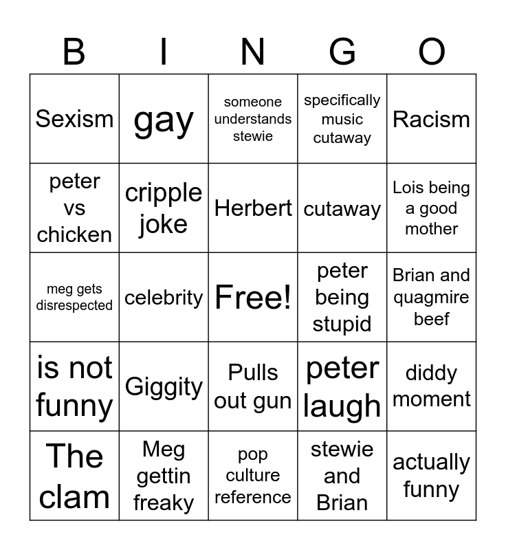 This bingo card has a free space and 24 words: Giggity, Meg gettin freaky, Herbert, The clam, Racism, Sexism, peter vs chicken, gay, peter being stupid, Pulls out gun, cutaway, meg gets disrespected, peter laugh, diddy moment, cripple joke, stewie and Brian, Brian and quagmire beef, someone understands stewie, Lois being a good mother, celebrity, actually funny, is not funny, specifically music cutaway and pop culture reference.