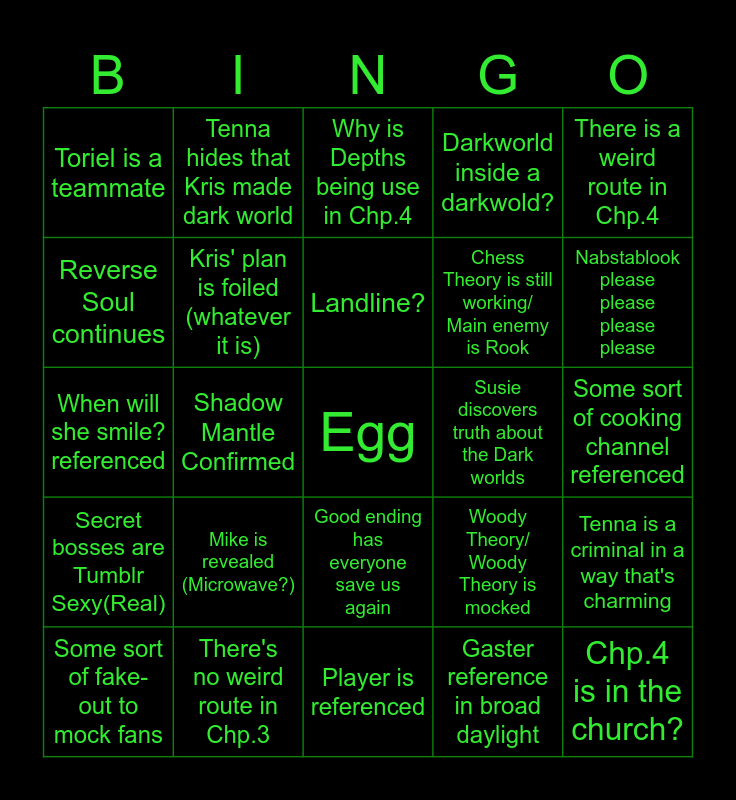 This bingo card has a free space and 24 words: Mike is revealed (Microwave?), There's no weird route in Chp.3, Landline?, Some sort of fake-out to mock fans, There is a weird route in Chp.4, Toriel is a teammate, Reverse Soul continues, Tenna hides that Kris made dark world, Susie discovers truth about the Dark worlds, Good ending has everyone save us again, Chess Theory is still working/ Main enemy is Rook, When will she smile? referenced, Woody Theory/ Woody Theory is mocked, Tenna is a criminal in a way that's charming, Kris' plan is foiled (whatever it is), Gaster reference in broad daylight, Some sort of cooking channel referenced, Why is Depths being use in Chp.4, Nabstablook please please please please, Shadow Mantle Confirmed, Chp.4 is in the church?, Secret bosses are Tumblr Sexy(Real), Darkworld inside a darkwold? and Player is referenced.