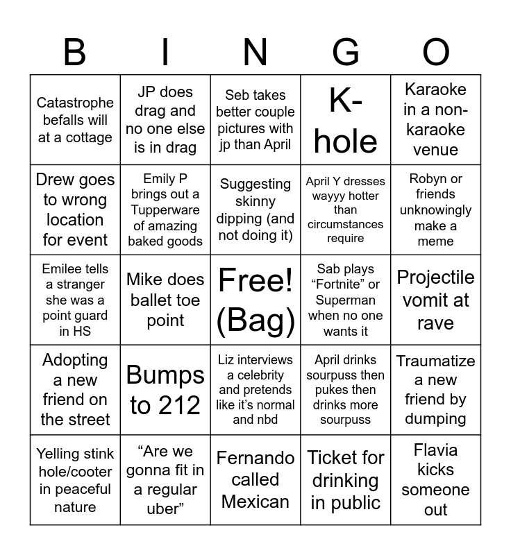 This bingo card has a free space and 24 words: Bumps to 212, “Are we gonna fit in a regular uber”, Suggesting skinny dipping (and not doing it), Yelling stink hole/cooter in peaceful nature, Karaoke in a non-karaoke venue, Catastrophe befalls will at a cottage, Drew goes to wrong location for event, JP does drag and no one else is in drag, Sab plays “Fortnite” or Superman when no one wants it, Liz interviews a celebrity and pretends like it’s normal and nbd, April Y dresses wayyy hotter than circumstances require, Emilee tells a stranger she was a point guard in HS, April drinks sourpuss then pukes then drinks more sourpuss, Traumatize a new friend by dumping, Emily P brings out a Tupperware of amazing baked goods, Ticket for drinking in public, Projectile vomit at rave, Seb takes better couple pictures with jp than April, Robyn or friends unknowingly make a meme, Mike does ballet toe point, Flavia kicks someone out, Adopting a new friend on the street, K-hole and Fernando called Mexican.
