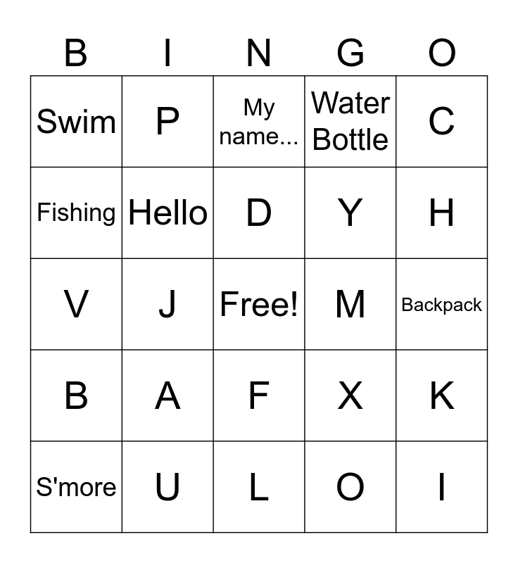 This bingo card has a free space and 37 words: Tent, Nice to meet you!, E, Hello, K, A, D, Campfire, C, Stars, J, Water Bottle, I, Backpack, Fishing, B, G, My name..., F, M, Swim, H, S'more, L, N, O, P, Q, R, S, T, U, V, W, X, Y and Z.