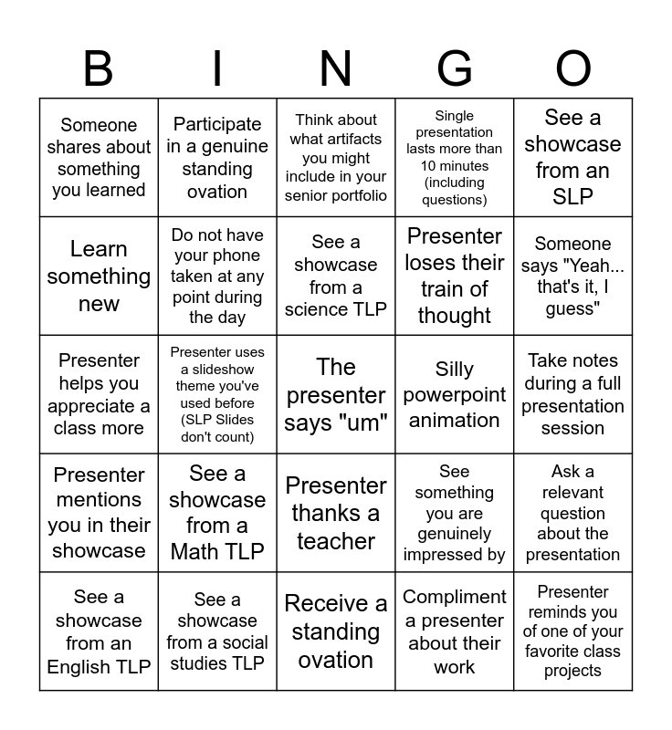 This bingo card has a free space and 24 words: See a showcase from a Math TLP, See a showcase from a social studies TLP, See a showcase from a science TLP, See a showcase from an English TLP, See a showcase from an SLP, Someone shares about something you learned, Learn something new, Participate in a genuine standing ovation, Silly powerpoint animation, Presenter thanks a teacher, Presenter loses their train of thought, Presenter helps you appreciate a class more, See something you are genuinely impressed by, Ask a relevant question about the presentation, Do not have your phone taken at any point during the day, Compliment a presenter about their work, Take notes during a full presentation session, Think about what artifacts you might include in your senior portfolio, Someone says "Yeah... that's it, I guess", Presenter uses a slideshow theme you've used before (SLP Slides don't count), Presenter reminds you of one of your favorite class projects, Presenter mentions you in their showcase, Single presentation lasts more than 10 minutes (including questions) and Receive a standing ovation.