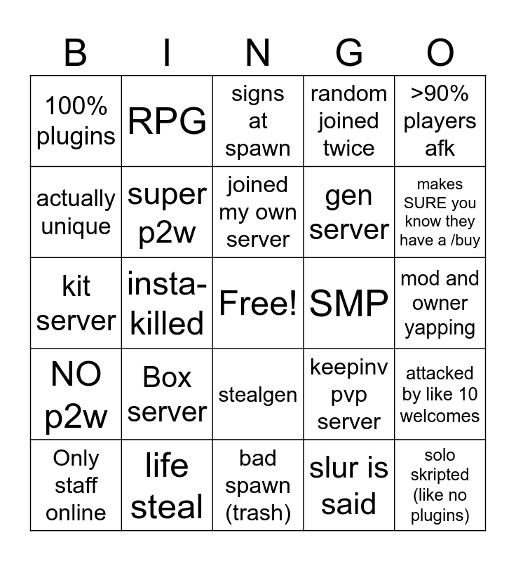 This bingo card has a free space and 24 words: Only staff online, Box server, joined my own server, slur is said, >90% players afk, 100% plugins, RPG, signs at spawn, SMP, mod and owner yapping, kit server, super p2w, keepinv pvp server, attacked by like 10 welcomes, actually unique, life steal, bad spawn (trash), random joined twice, makes SURE you know they have a /buy, NO p2w, insta-killed, stealgen, gen server and solo skripted (like no plugins).