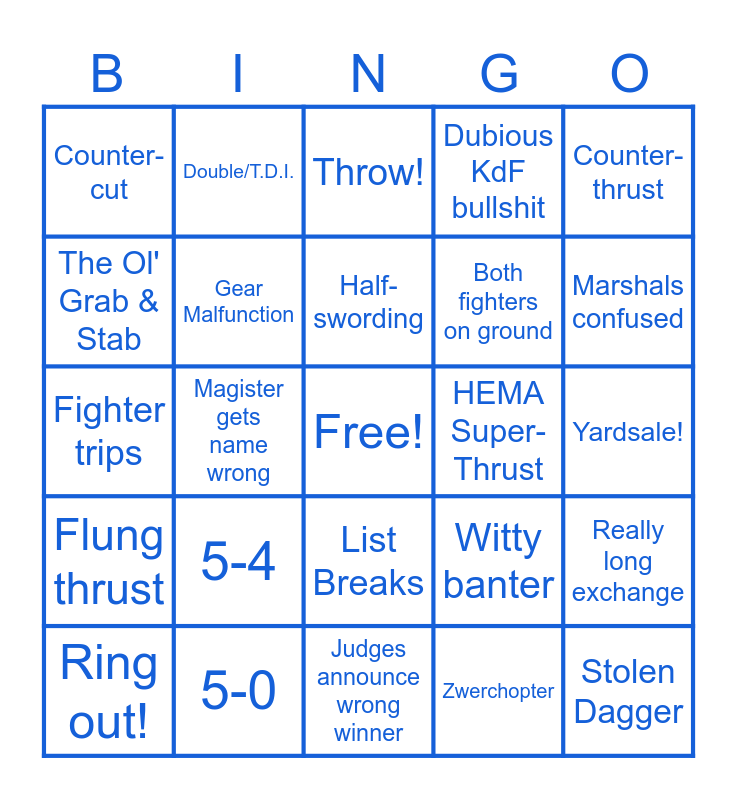This bingo card has a free space and 24 words: 5-4, 5-0, Half-swording, Ring out!, Counter-thrust, Counter-cut, The Ol' Grab & Stab, Double/T.D.I., HEMA Super-Thrust, List Breaks, Both fighters on ground, Fighter trips, Witty banter, Really long exchange, Gear Malfunction, Zwerchopter, Yardsale!, Throw!, Marshals confused, Magister gets name wrong, Stolen Dagger, Flung thrust, Dubious KdF bullshit and Judges announce wrong winner.