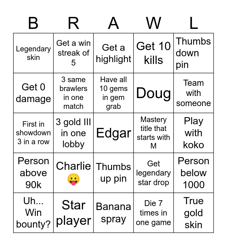 This bingo card has a free space and 24 words: Uh... Win bounty?, Charlie 😛, Have all 10 gems in gem grab, Die 7 times in one game, Thumbs down pin, Legendary skin, Get a win streak of 5, Get a highlight, Mastery title that starts with M, Play with koko, First in showdown 3 in a row, 3 same brawlers in one match, Get legendary star drop, Person below 1000, Get 0 damage, Star player, Banana spray, Get 10 kills, Team with someone, Person above 90k, 3 gold III in one lobby, Thumbs up pin, Doug and True gold skin.