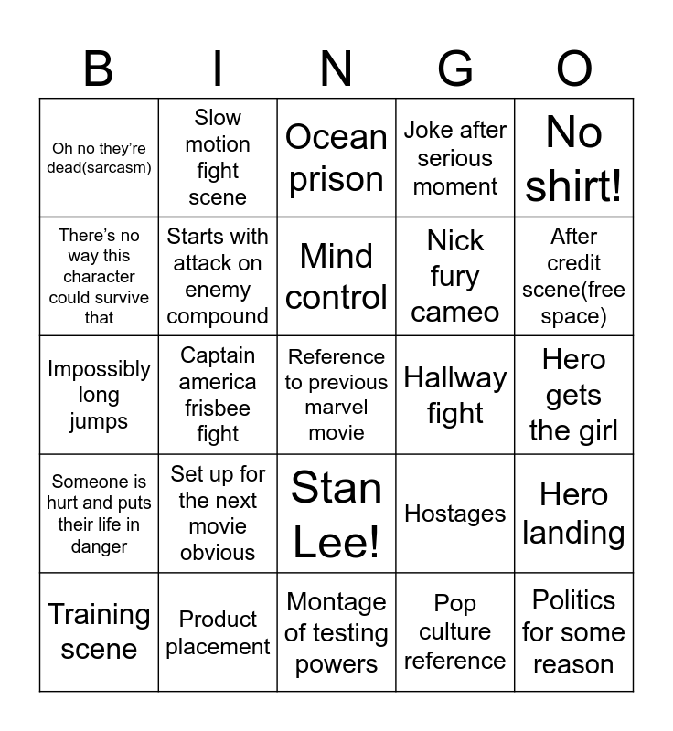 This bingo card has a free space and 36 words: Free!, Villain Redeemed, Sidekick, Starts with attack on enemy compound, Hostages, Someone is hurt and puts their life in danger, Mind control, Villain of the week, No shirt!, Bad cgi, Captain america frisbee fight, Joke after serious moment, Underground lab, Hallway fight, After credit scene(free space), Oh no they’re dead(sarcasm), Helicopter Helicopter, Set up for the next movie obvious, Politics for some reason, Ocean prison, Hero gets the girl, Hero landing, Product placement, Training scene, Montage of testing powers, Slow motion fight scene, Impossibly long jumps, Lots of running, Nick fury cameo, There’s no way this character could survive that, Origin explained, Villain monologue, Pop culture reference, Stan Lee!, Marvel logo with past movies and Special marvrel logo.