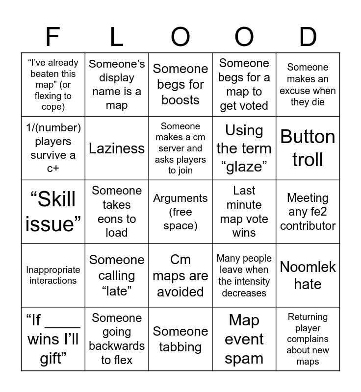 This bingo card has a free space and 24 words: Someone calling “late”, Someone going backwards to flex, Someone makes a cm server and asks players to join, “If ____ wins I’ll gift”, Someone makes an excuse when they die, “I’ve already beaten this map” (or flexing to cope), 1/(number) players survive a c+, Someone’s display name is a map, Last minute map vote wins, Cm maps are avoided, Using the term “glaze”, “Skill issue”, Many people leave when the intensity decreases, Noomlek hate, Laziness, Map event spam, Meeting any fe2 contributor, Someone begs for boosts, Button troll, Someone takes eons to load, Returning player complains about new maps, Inappropriate interactions, Someone begs for a map to get voted and Someone tabbing.
