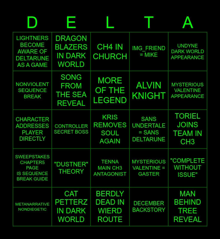 This bingo card has 75 words: DON'T FORGET LYRICS APPEAR, ANGEL DOLL SECRET BOSS, MORE OF THE LEGEND, RUDY DIES, "HAPSTABLOOK" APPEARANCE, GETTING DARKER THAN DARK, BUNKER OPENING, FESTIVAL PREPERATION, SUSIE FIGHT, VESSEL APPEARANCE, MORE OF UNUSED DIALOG APPEARS, DISCARDED FLOWERS SECRET BOSS, TENNA MAIN CH3 ANTAGONIST, ALVIN KNIGHT, PAPYRUS APPEARANCE, NONVIOLENT SEQUENCE BREAK, CAT PETTERZ IN DARK WORLD, BERDLY DEAD IN WIERD ROUTE, KRIS KNIGHT, MYSTERIOUS VALENTINE APPEARANCE, NEW GASTER DIALOG, DRAGON BLAZERS IN DARK WORLD, KRIS REMOVES SOUL AGAIN, IMG_FRIEND = MIKE, UNDYNE DARK WORLD APPEARANCE, VESSEL KNIGHT, SKY MANTLE OBTAINED, SHADOW CRYSTAL FOR EACH CHAPTER, MAN BEHIND TREE = GASTER, ANGEL REVEAL, SAVE FILE SHENANIGANS, GAS LEAK, EGG FOR EACH CHAPTER, MYSTERIOUS VALENTINE = GASTER, TORIEL JOINS TEAM IN CH3, LIGHTNERS BECOME AWARE OF DELTARUNE AS A GAME, PURPLE SOUL MODE, RALSEI DIVERTS PLAYER AGAIN, SANS UNDERTALE = SANS DELTARUNE, MAN BEHIND TREE REVEAL, HEAVEN = REAL WORLD/DEVICE, GREEN SOUL MODE, SHADOW MANTLE REQUIRED TO BEAT CH3 SECRET BOSS, NOELLE GAME GLITCHES BACKSTORY, IMG_FRIEND APPEARANCE, DEVICE THEORY, CONTROLLER SECRET BOSS, CH4 IN CHURCH, RALSEI BACKSTORY/ REVEALS, MAYOR HOLIDAY APPEARANCE, OBLIVION THEORY, SONG FROM THE SEA REVEAL, SHADOW CRYSTAL USE REVEALED, SUSIE BACKSTORY, SWEEPSTAKES CHAIR APPEARANCE, METANARRATIVE DIEGETIC, CHESS THEORY, COOKING SHOW, ASGORE BACKSTORY, KNIGHT REVEAL, METANARRATIVE NONDIEGETIC, MIKE CH3 SECRET BOSS, SUSIEZILLA, KRIS BACKSTORY, SEVEN KNIGHTS THEORY, CHARACTER ADDRESSES PLAYER DIRECTLY, COWBOY SECTION NOT CANCELLED, TORIEL IN DARK WORLD, SANS BACKSTORY, "COMPLETE WITHOUT ISSUE", SWEEPSTAKES CHAPTER5 PAGE IS SEQUENCE BREAK GUIDE, "DUSTNER" THEORY, JOCKINGTON ACTUALLY GROWS A BEARD, DECEMBER BACKSTORY and WOODY THEORY.