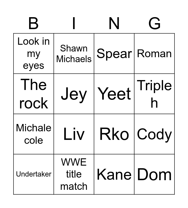 This bingo card has 17 words: Kane, Undertaker, Spear, Look in my eyes, Liv, Roman, Cody, Yeet, Triple h, Jey, WWE title match, Rko, The rock, Shawn Michaels, Michale cole, Bron breaker and Dom.