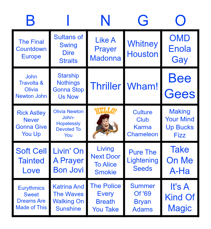 This bingo card has a free space and 42 words: Reet Petite Jacki Wilson, Thriller, Like A Virgin Madonna, Livin' On A Prayer Bon Jovi, Summer Of '69 Bryan Adams, Take On Me A-Ha, It's A Kind Of Magic, Kim Wilde Kids In America, Like A Prayer Madonna, Living Next Door To Alice Smokie, Making Your Mind Up Bucks Fizz, Bee Gees, Olivia Newton John-Hopelessly Devoted To You, OMD Enola Gay, Power Of Love Huey Lewis & The News, Pure The Lightening Seeds, Rhythm Of My Heart Rod Stewart, Rick Astley Never Gonna Give You Up, Stumblin' In Suzie Quatro & Chris Norman, Sultans of Swing Dire Straits, John Travolta & Olivia Newton John, Tears For Fears Everybody Wants To Rule The World, The Cure Friday I'm In Love, The Final Countdown Europe, This Time I Know It's For Real Donna Summer, Tight Fit The Lion Sleeps Tonight, Wham!, You Cant Hurry Love Phill Collins, Diana Ross Chain Reaction, Jennifer Rush The Power Of Love, Billy Joel Uptown Girl, Soft Cell Tainted Love, Starship Nothings Gonna Stop Us Now, The Police Every Breath You Take, Survivor Eye Of The Tiger, Eurythmics Sweet Dreams Are Made of This, Katrina And The Waves Walking On Sunshine, Culture Club Karma Chameleon, Dexys Midnight Runners, Fleetwood Mac Everywhere, Whitney Houston and Dancing In The Dark Bruce Springsteen.