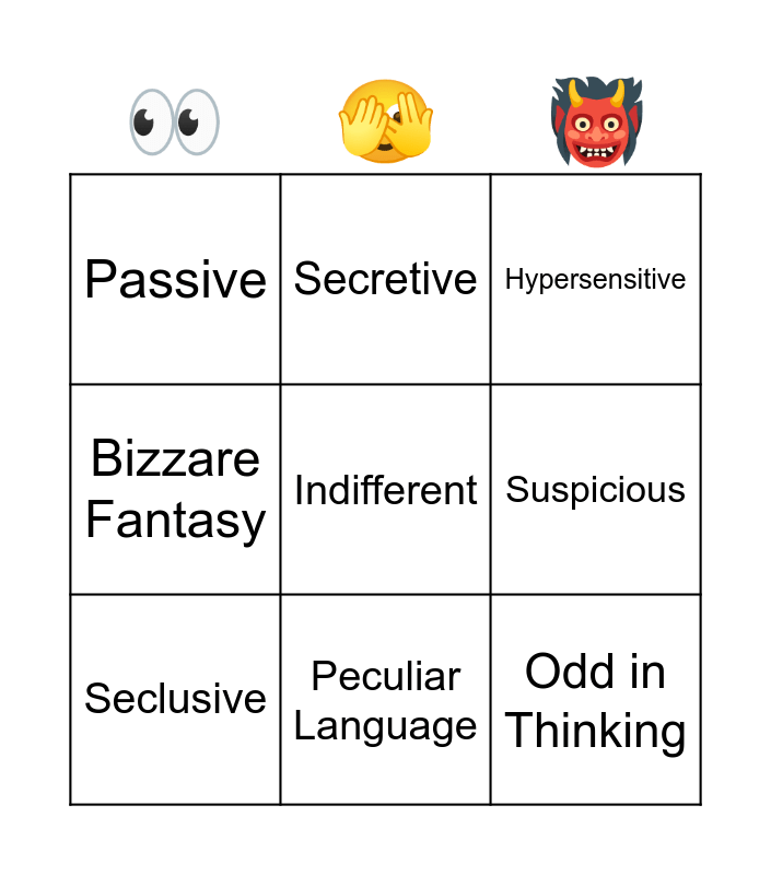 This bingo card has a free space and 8 words: Suspicious, Hypersensitive, Secretive, Seclusive, Passive, Odd in Thinking, Bizzare Fantasy and Peculiar Language.