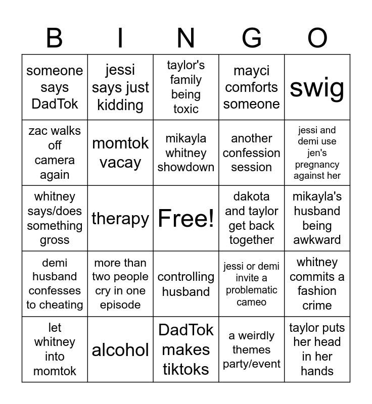 This bingo card has a free space and 24 words: more than two people cry in one episode, alcohol, mikayla whitney showdown, let whitney into momtok, swig, someone says DadTok, zac walks off camera again, jessi says just kidding, dakota and taylor get back together, controlling husband, another confession session, whitney says/does something gross, jessi or demi invite a problematic cameo, whitney commits a fashion crime, momtok vacay, a weirdly themes party/event, mikayla's husband being awkward, taylor's family being toxic, jessi and demi use jen's pregnancy against her, therapy, taylor puts her head in her hands, demi husband confesses to cheating, mayci comforts someone and DadTok makes tiktoks.