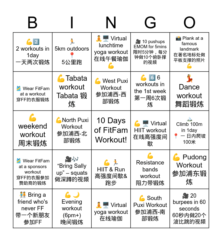 This bingo card has a free space and 24 words: 🎥🎶 “Bring Sally up” – squats 做深蹲的视频, 💪 🌙 Evening workout (6pm+) 晚间锻炼, 💪 West Puxi Workout 参加浦西-西部锻炼, 🧑🤝🧑 Bring a friend who's never FF 带一个新朋友参加FF, 📸 Plank at a famous landmark 在著名地标处做平板支撑的照片💪, 💪2️⃣ 2 workouts in 1day 一天两次锻炼, 🎽 Wear FitFam at a workout 穿FF的衣服锻炼, 🏃 5km outdoors 📍 5公里跑, 💪 🖥️ Virtual HIIT workout 在线高强度间歇, 💪 🏃 HIIT & Run 高强度间歇&跑步, 💪 6️⃣ 6 workouts in the 1st week 第一周6次锻炼, 💪 weekend workout 周末锻炼, 💪 Resistance bands workout 阻力带锻炼, 💪 Pudong Workout 参加浦东锻炼, 💪Tabata workout Tabata 锻炼, 💪 South Puxi Workout 参加浦西-南部锻炼, 🏔️ Climb 100m in 1day 📍 一 日内爬坡 100米, 🧘🖥️ Virtual lunchtime yoga workout 在线午餐瑜伽💪, 💃 Dance workout 舞蹈锻炼, 💪North Puxi Workout 参加浦西-北部锻炼, 🎥 20 burpees in 60 seconds 60秒内做20个波比跳的视频, 🎽 Wear FitFam at a sponsors workout 穿FF的衣服参加赞助商的锻炼, 🎥 10 pushups EMOM for 5mins 限时5分钟,每分钟做10个俯卧撑的视频 and 🧘🖥️ Virtual yoga workout 在线瑜伽.