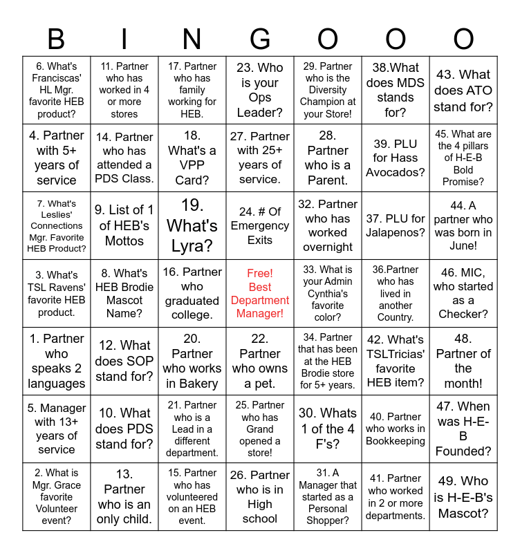 This bingo card has a free space and 48 words: 1. Partner who speaks 2 languages, 8. What's HEB Brodie Mascot Name?, 15. Partner who has volunteered on an HEB event., 22. Partner who owns a pet., 28. Partner who is a Parent., 36.Partner who has lived in another Country., 43. What does ATO stand for?, 2. What is Mgr. Grace favorite Volunteer event?, 9. List of 1 of HEB's Mottos, 16. Partner who graduated college., 23. Who is your Ops Leader?, 29. Partner who is the Diversity Champion at your Store!, 37. PLU for Jalapenos?, 44. A partner who was born in June!, 3. What's TSL Ravens' favorite HEB product., 10. What does PDS stand for?, 17. Partner who has family working for HEB., 24. # Of Emergency Exits, 30. Whats 1 of the 4 F's?, 38.What does MDS stands for?, 45. What are the 4 pillars of H-E-B Bold Promise?, 4. Partner with 5+ years of service, 11. Partner who has worked in 4 or more stores, 18. What's a VPP Card?, 31. A Manager that started as a Personal Shopper?, 39. PLU for Hass Avocados?, 46. MIC, who started as a Checker?, 5. Manager with 13+ years of service, 12. What does SOP stand for?, 19. What's Lyra?, 25. Partner who has Grand opened a store!, 32. Partner who has worked overnight, 40. Partner who works in Bookkeeping, 47. When was H-E-B Founded?, 6. What's Franciscas' HL Mgr. favorite HEB product?, 13. Partner who is an only child., 20. Partner who works in Bakery, 26. Partner who is in High school, 33. What is your Admin Cynthia's favorite color?, 41. Partner who worked in 2 or more departments., 48. Partner of the month!, 7. What's Leslies' Connections Mgr. Favorite HEB Product?, 14. Partner who has attended a PDS Class., 21. Partner who is a Lead in a different department., 27. Partner with 25+ years of service., 34. Partner that has been at the HEB Brodie store for 5+ years., 42. What's TSLTricias' favorite HEB item? and 49. Who is H-E-B's Mascot?.