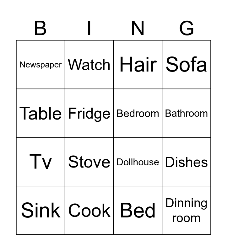 This bingo card has 16 words: Cook, Dishes, Hair, Newspaper, Tv, Watch, Dollhouse, Bed, Table, Fridge, Sink, Sofa, Stove, Bathroom, Bedroom and Dinning room.