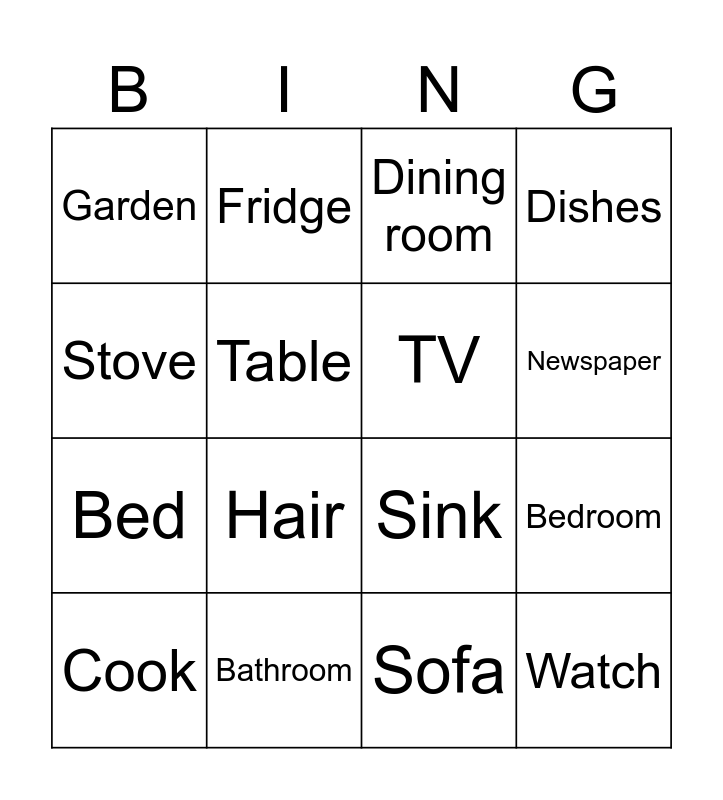 This bingo card has 16 words: Bathroom, Bedroom, Dining room, Garden, Bed, Fridge, Sink, Sofa, Stove, Table, Cook, Dishes, Hair, Newspaper, TV and Watch.