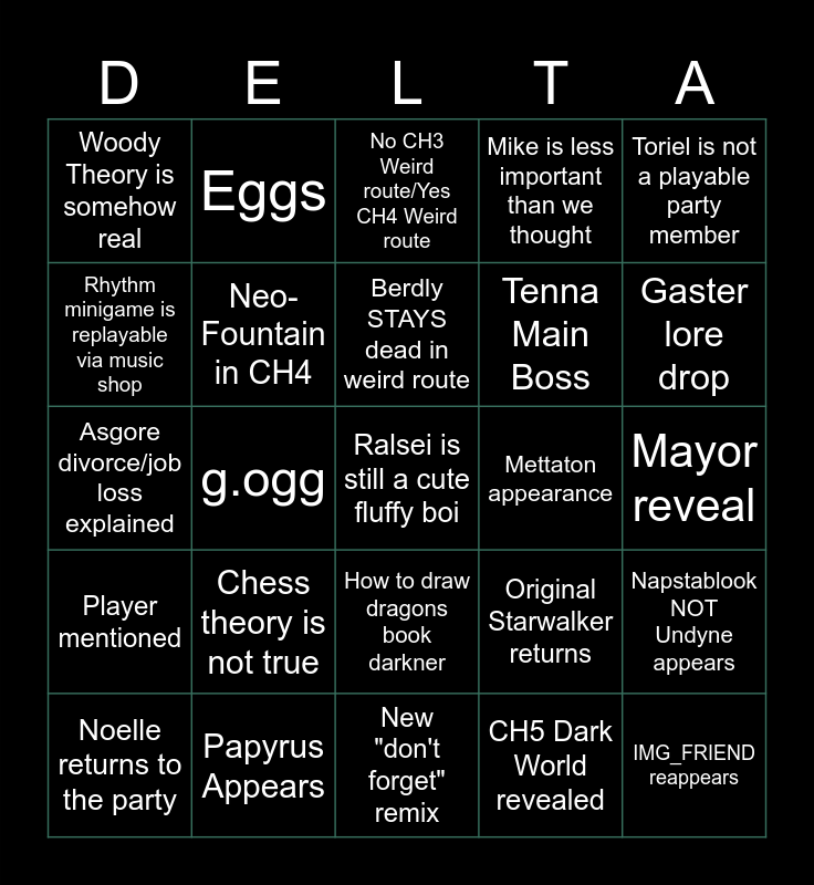This bingo card has a free space and 24 words: Chess theory is not true, Papyrus Appears, Berdly STAYS dead in weird route, Noelle returns to the party, Toriel is not a playable party member, Woody Theory is somehow real, Rhythm minigame is replayable via music shop, Eggs, Mettaton appearance, How to draw dragons book darkner, Tenna Main Boss, Asgore divorce/job loss explained, Original Starwalker returns, Napstablook NOT Undyne appears, Neo-Fountain in CH4, CH5 Dark World revealed, Mayor reveal, No CH3 Weird route/Yes CH4 Weird route, Gaster lore drop, g.ogg, IMG_FRIEND reappears, Player mentioned, Mike is less important than we thought and New "don't forget" remix.