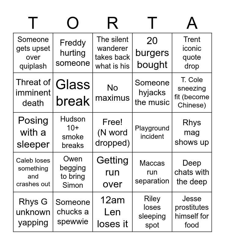 This bingo card has a free space and 24 words: Owen begging to bring Simon, Someone chucks a spewwie, No maximus, Rhys G unknown yapping, Trent iconic quote drop, Someone gets upset over quiplash, Threat of imminent death, Freddy hurting someone, Playground incident, Getting run over, Someone hyjacks the music, Posing with a sleeper, Maccas run separation, Deep chats with the deep, Glass break, Riley loses sleeping spot, Rhys mag shows up, The silent wanderer takes back what is his, T. Cole sneezing fit (become Chinese), Hudson 10+ smoke breaks, Jesse prostitutes himself for food, Caleb loses something and crashes out, 20 burgers bought and 12am Len loses it.