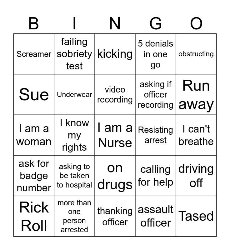 This bingo card has a free space and 24 words: asking to be taken to hospital, more than one person arrested, video recording, Rick Roll, obstructing, Screamer, Sue, failing sobriety test, Resisting arrest, on drugs, asking if officer recording, I am a woman, calling for help, driving off, Underwear, assault officer, I can't breathe, kicking, Run away, I know my rights, Tased, ask for badge number, 5 denials in one go and thanking officer.