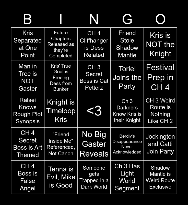 This bingo card has a free space and 24 words: "Friend Inside Me" Referenced, Not Canon, Tenna is Evil, Mike is Good, CH 3 Secret Boss is Cat Petterz, CH 4 Boss is False Angel, Kris is NOT the Knight, Kris Separated at One Point, Man in Tree is NOT Gaster, Future Chapters Released as they're Completed, Ch 3 Darkners Know Kris is their Knight, No Big Gaster Reveals, Toriel Joins the Party, Ralsei Knows Rough Plot Synopsis, Berdly's Disappearance Never Acknowledged, Jockington and Catti Join Party, Kris' True Goal is Freeing Dess from Bunker, Ch 3 Has Light World Segment, CH 3 Weird Route is Nothing Like CH 2, CH 4 Cliffhanger is Dess Related, Festival Prep in CH 4, Knight is Timeloop Kris, Shadow Mantle is Weird Route Exclusive, CH 4 Secret Boss is Art Themed, Friend Stole Shadow Mantle and Someone gets Trapped in a Dark World.