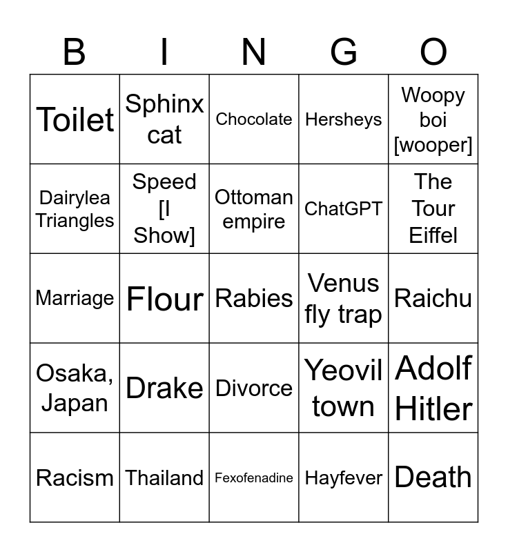 This bingo card has 25 words: Osaka, Japan, Thailand, Rabies, Hayfever, Woopy boi [wooper], Toilet, Sphinx cat, Chocolate, Venus fly trap, Adolf Hitler, Dairylea Triangles, Speed [I Show], Fexofenadine, Yeovil town, The Tour Eiffel, Racism, Flour, Ottoman empire, ChatGPT, Raichu, Marriage, Drake, Divorce, Hersheys and Death.