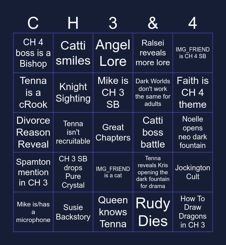 This bingo card has a free space and 24 words: CH 3 SB drops Pure Crystal, Susie Backstory, Mike is CH 3 SB, Mike is/has a microphone, IMG_FRIEND is CH 4 SB, CH 4 boss is a Bishop, Tenna is a cRook, Catti smiles, Catti boss battle, IMG_FRIEND is a cat, Dark Worlds don't work the same for adults, Divorce Reason Reveal, Tenna reveals Kris opening the dark fountain for drama, Jockington Cult, Knight Sighting, Rudy Dies, Noelle opens neo dark fountain, Angel Lore, Faith is CH 4 theme, Tenna isn't recruitable, How To Draw Dragons in CH 3, Spamton mention in CH 3, Ralsei reveals more lore and Queen knows Tenna.