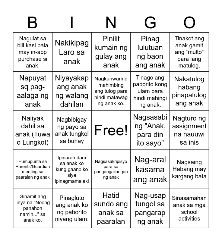 This bingo card has a free space and 24 words: Ipinaramdam sa anak ko kung gaano ko siya ipinagmamalaki, Pinagluto ang anak ko ng paborito niyang ulam., Nagkunwaring mahimbing ang tulog para hindi matawag ng anak ko., Ginamit ang linya na “Noong panahon namin...” sa anak ko., Tinakot ang anak gamit ang “multo” para lang matulog., Nagulat sa bill kasi pala may in-app purchase si anak., Napuyat sq pag-aalaga ng anak, Nakikipag Laro sa anak, Nagsasabi ng "Anak, para din ito sayo", Nagsasakripisyo para sa pangangailangan ng anak, Tinago ang paborito kong ulam para hindi mahingi ng anak., Naiiyak dahil sa anak (Tuwa o Lungkot), Nag-aral kasama ang anak, Nagsaing Habang may kargang bata, Niyayakap ang anak ng walang dahilan, Nag-usap tungol sa pangarap ng anak, Nagturo ng assignment na nauuwi sa inis, Pinilit kumain ng gulay ang anak, Nakatulog habang pinapatulog ang anak, Nagbibigay ng payo sa anak tungkol sa buhay, Sinasamahan anak sa mga school activities, Pumupunta sa Parents/Guardian meeting sa paaralan ng anak, Pinag lulutuan ng baon ang anak and Hatid sundo ang anak sa paaralan.