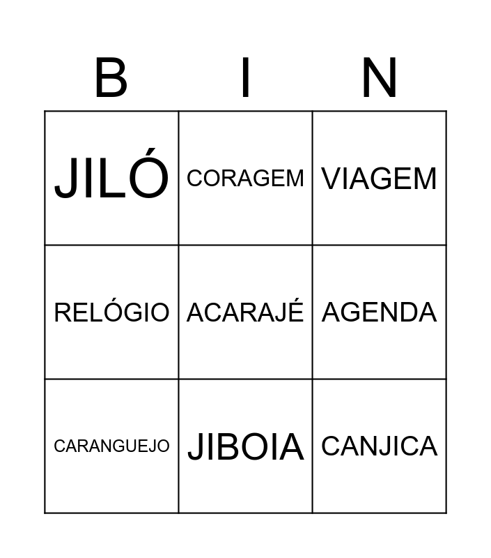 This bingo card has a free space and 8 words: AGENDA, VIAGEM, CORAGEM, CARANGUEJO, JILÓ, CANJICA, RELÓGIO and JIBOIA.