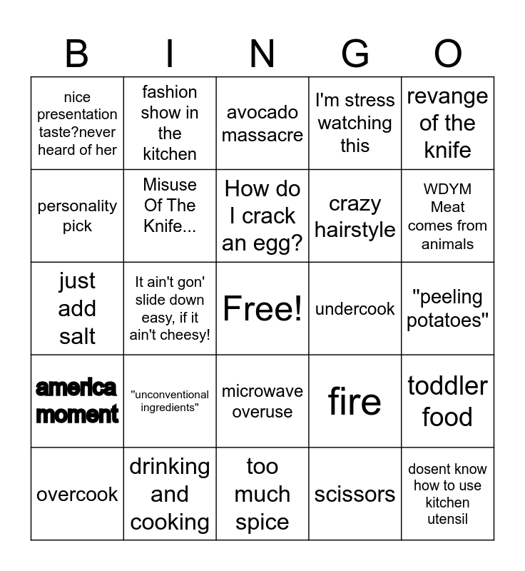 This bingo card has a free space and 24 words: ''unconventional ingredients'', drinking and cooking, How do I crack an egg?, overcook, revange of the knife, nice presentation taste?never heard of her, personality pick, fashion show in the kitchen, undercook, microwave overuse, crazy hairstyle, just add salt, fire, toddler food, Misuse Of The Knife..., scissors, ''peeling potatoes'', avocado massacre, WDYM Meat comes from animals, It ain't gon' slide down easy, if it ain't cheesy!, dosent know how to use kitchen utensil, america moment, I'm stress watching this and too much spice.