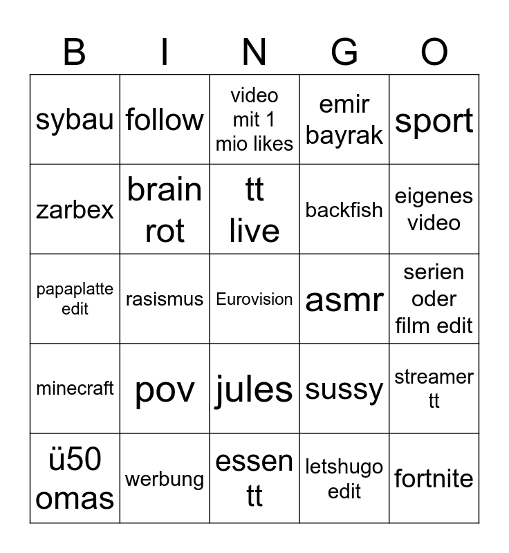 This bingo card has a free space and 24 words: pov, werbung, tt live, ü50 omas, sport, sybau, zarbex, follow, asmr, jules, backfish, papaplatte edit, sussy, streamer tt, brain rot, letshugo edit, serien oder film edit, video mit 1 mio likes, eigenes video, rasismus, fortnite, minecraft, emir bayrak and essen tt.