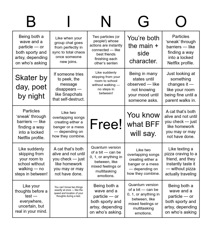 This bingo card has a free space and 24 words: A cat that’s both alive and not until you check — just like homework you may or may not have done., You can’t know two things exactly at once — like the speed and location of your thoughts during a test., Like suddenly skipping from your room to school without walking — no steps in between!, Like your thoughts before a test — everywhere, uncertain, but real in your mind., Particles ‘sneak’ through barriers — like finding a way into a locked Netflix profile., Being both a wave and a particle — or both sporty and artsy, depending on who’s asking, Skater by day, poet by night, Like when your group chat goes from perfectly in sync to total chaos once someone new joins., You know what BFF will say., Quantum version of a bit — can be 0, 1, or anything in between, like mixed feelings or multitasking emotions., Being in many states until observed — like not knowing your mood until someone asks., Particles ‘sneak’ through barriers — like finding a way into a locked Netflix profile., Like two overlapping songs creating either a banger or a mess — depending on how they combine., Like texting a pizza craving to a friend, and they instantly taste it — without pizza actually traveling, If someone tries to peek, the message disappears — like Snapchats that self-destruct., Quantum version of a bit — can be 0, 1, or anything in between, like mixed feelings or multitasking emotions., A cat that’s both alive and not until you check — just like homework you may or may not have done., Two particles (or people!) whose actions are instantly connected — like best friends finishing each other’s senten, Just looking at something changes it — like your room being fine until a parent walks in., Like two overlapping songs creating either a banger or a mess — depending on how they combine., Being both a wave and a particle — or both sporty and artsy, depending on who’s asking, Like suddenly skipping from your room to school without walking — no steps in between!, You’re both the main + side character. and Being both a wave and a particle — or both sporty and artsy, depending on who’s asking..