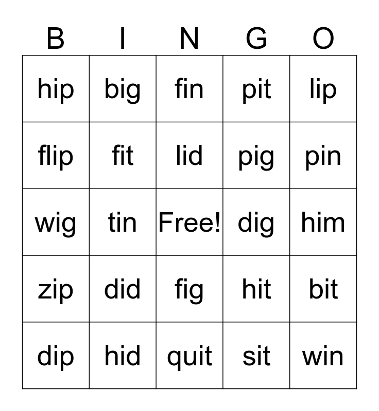 This bingo card has a free space and 24 words: did, hid, lid, dip, lip, hip, flip, big, dig, fig, pig, wig, hit, bit, fit, sit, him, fin, pin, tin, win, zip, pit and quit.
