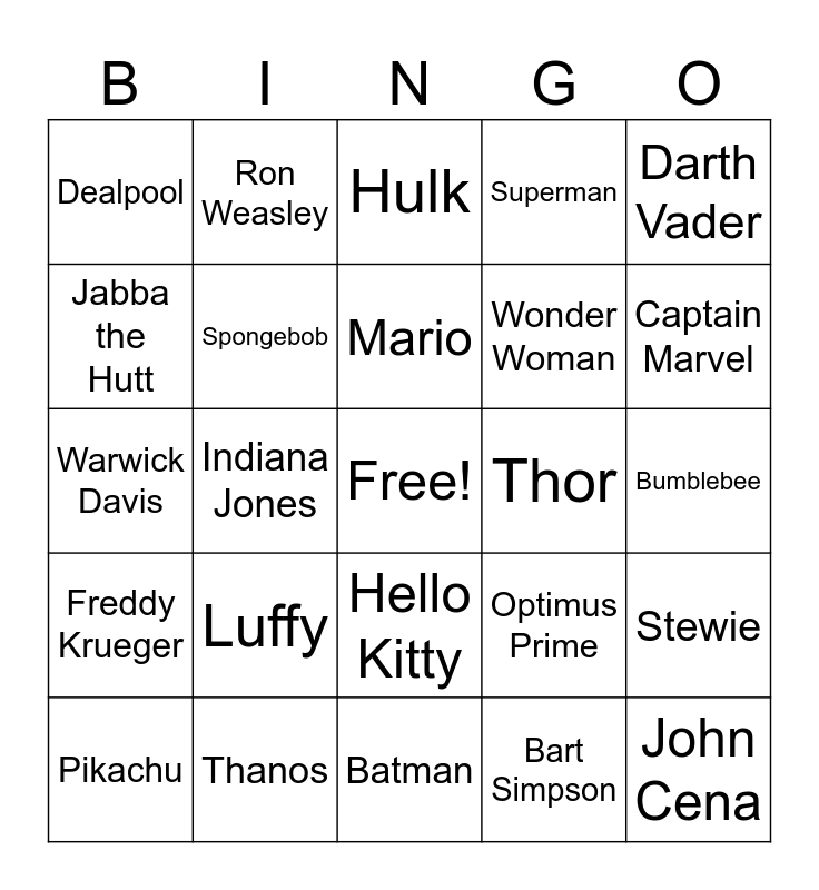 This bingo card has a free space and 39 words: Ninja Turtles, Scooby Doo, Jack Sparrow, Spongebob, Pikachu, Hello Kitty, Mario, Captain America, Darth Vader, Freddy Krueger, Indiana Jones, Superman, John Cena, Bumblebee, Thor, Luffy, Stormtropper, Dealpool, Sonic, Optimus Prime, Jabba the Hutt, Batman, Wonder Woman, Captain Marvel, Kurt Angle, Scott Steiner, Harry Potter, Shaggy, Hermione Granger, Ron Weasley, Kungfu Panda, Spiderman, Hulk, Thanos, Bart Simpson, Homer Simpson, Stewie, Warwick Davis and Frodo.