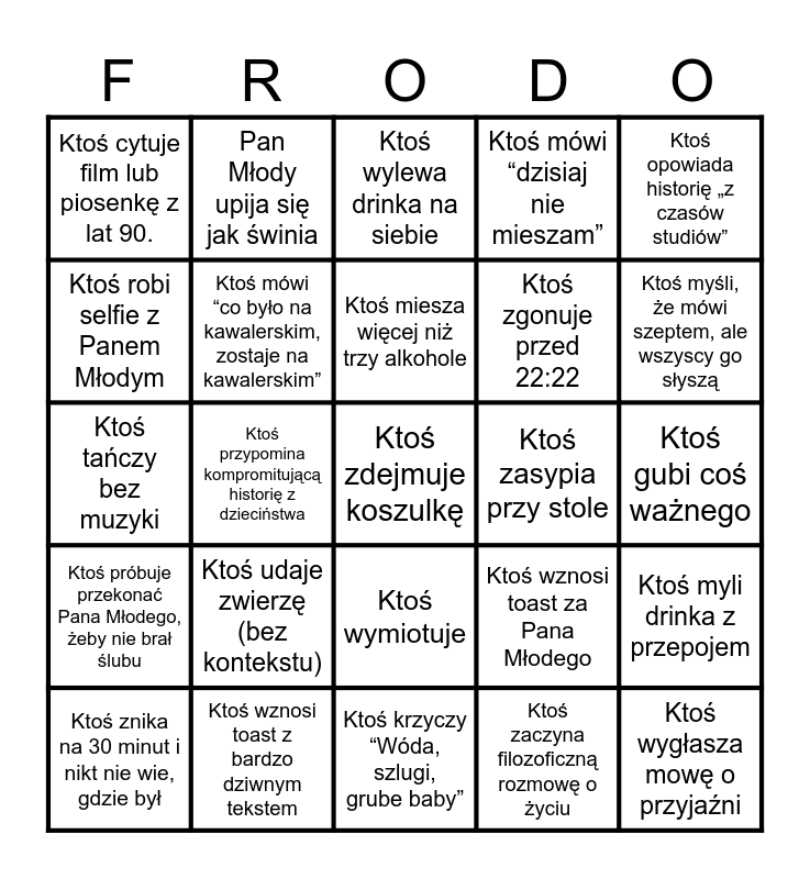 This bingo card has a free space and 24 words: Ktoś udaje zwierzę (bez kontekstu), Ktoś wznosi toast z bardzo dziwnym tekstem, Ktoś miesza więcej niż trzy alkohole, Ktoś znika na 30 minut i nikt nie wie, gdzie był, Ktoś opowiada historię „z czasów studiów”, Ktoś cytuje film lub piosenkę z lat 90., Ktoś robi selfie z Panem Młodym, Pan Młody upija się jak świnia, Ktoś zasypia przy stole, Ktoś wymiotuje, Ktoś zgonuje przed 22:22, Ktoś tańczy bez muzyki, Ktoś wznosi toast za Pana Młodego, Ktoś myli drinka z przepojem, Ktoś mówi “co było na kawalerskim, zostaje na kawalerskim”, Ktoś zaczyna filozoficzną rozmowę o życiu, Ktoś gubi coś ważnego, Ktoś wylewa drinka na siebie, Ktoś myśli, że mówi szeptem, ale wszyscy go słyszą, Ktoś przypomina kompromitującą historię z dzieciństwa, Ktoś wygłasza mowę o przyjaźni, Ktoś próbuje przekonać Pana Młodego, żeby nie brał ślubu, Ktoś mówi “dzisiaj nie mieszam” and Ktoś krzyczy “Wóda, szlugi, grube baby”.