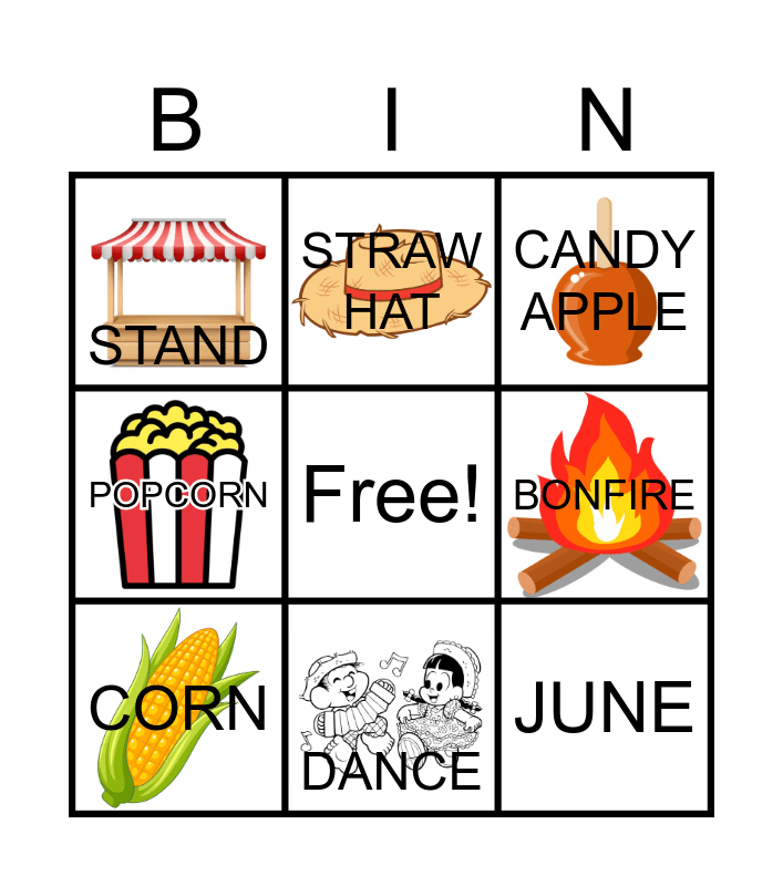 This bingo card has 7 images, a free space and 8 words: BONFIRE, CANDY APPLE, STRAW HAT, CORN, STAND, JUNE, POPCORN and DANCE.
