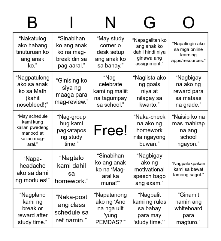 This bingo card has a free space and 49 words: “Nag-review ako ng notes ng anak ko kahit minsan.”, “Sinabihan ko ang anak ko na ‘Mag-aral ka muna!’”, “Alam ko ang schedule ng quizzes nila.”, “Naka-post ang class schedule sa ref namin.”, “Naka-check na ako ng homework nila ngayong buwan.”, “Ginawan ko siya ng kopya ng notes niya.”, “May study corner o desk setup ang anak ko sa bahay.”, “Gumawa kami ng daily study schedule.”, “Ginising ko siya ng maaga para mag-review.”, “Sinamahan ko siya sa paggawa ng visual aids.”, “Nagbigay na ako ng reward para sa mataas na grade.”, “Sinabihan ko ang anak ko na mag-break din sa pag-aaral.”, “Nagbigay ako ng motivational speech bago ang exam.”, “Nagplano kami ng break or reward after study time.”, “Natuwa ako sa score niya dahil kami ang nag-review.”, “Nagpalakpakan kami sa bawat tamang sagot.”, “Nag-group hug kami pagkatapos ng study time.”, “Naglista ako ng goals niya at nilagay sa kwarto.”, “May stickers or points system kami sa bahay.”, “Nag-celebrate kami ng maliit na tagumpay sa school.”, “Nagpatulong ako sa anak ko sa Math (kahit nosebleed!)”, “Na-stress ako dahil sa project ng anak ko.”, “Napagalitan ko ang anak ko dahil hindi niya ginawa ang assignment.”, “Nakatulog ako habang tinuturuan ko ang anak ko.”, “Pinagalitan ko siya kasi nag-aaral habang nakahiga.”, “Naisip ko na mas mahirap na ang school ngayon.”, “Nagtalo kami dahil sa homework.”, “Nag-multitask ako habang nagtuturo.”, “Napa-headache ako sa dami ng modules!”, “Naghanap ako sa YouTube ng topic na tinuturo sa kanila.”, “Nag-print ako ng reviewer materials sa bahay or computer shop.”, “Tinulungan ko siyang gumawa ng flashcards.”, “Gumamit kami ng timer para sa review sessions.”, “Tinuruan ko siya kung paano mag-memorize gamit ang acronym.”, “Naglaro kami ng Q&A quiz bilang review.”, “Ginamit namin ang whiteboard para magturo.”, “Nag-review kami habang naglalakad o nagluluto.”, “May reviewer kaming gawa sa colored paper.”, “May schedule kami kung kailan pwedeng manood at kailan mag-aral.”, “Nakapag-aral kami gamit ang cellphone lang.”, “Nagsulat ako sa notebook niya para tulungan siya.”, “Pinanood namin ang Edukasyon PH or DepEd video lessons.”, “Nagpalit kami ng rules sa bahay para may ‘study time.’”, “Nakatikim ako ng attitude habang tinuturuan ko siya 😅.”, “Napatanong ako ng ‘Ano na nga ulit 'yung PEMDAS?’”, “Napatingin ako sa mga online learning apps/resources.”, “Nag-group study sila sa bahay namin (o online).”, “Naubos ang ink namin dahil sa homework printing.” and “Naghanap ako ng reviewer sa Facebook group or GC.”.