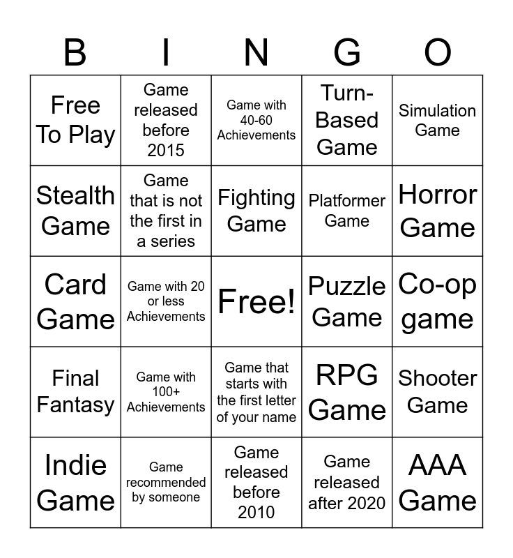 This bingo card has a free space and 24 words: Game with 100+ Achievements, Game recommended by someone, Fighting Game, Indie Game, Simulation Game, Free To Play, Stealth Game, Game released before 2015, Puzzle Game, Game that starts with the first letter of your name, Platformer Game, Card Game, RPG Game, Shooter Game, Game that is not the first in a series, Game released after 2020, Co-op game, Game with 40-60 Achievements, Horror Game, Game with 20 or less Achievements, AAA Game, Final Fantasy, Turn-Based Game and Game released before 2010.