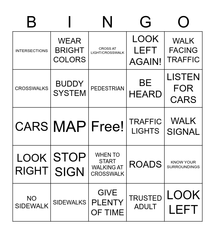 This bingo card has a free space and 24 words: STOP SIGN, SIDEWALKS, PEDESTRIAN, NO SIDEWALK, WALK FACING TRAFFIC, INTERSECTIONS, CROSSWALKS, WEAR BRIGHT COLORS, TRAFFIC LIGHTS, WHEN TO START WALKING AT CROSSWALK, BE HEARD, CARS, ROADS, KNOW YOUR SURROUNDINGS, BUDDY SYSTEM, TRUSTED ADULT, WALK SIGNAL, CROSS AT LIGHT/CROSSWALK, LISTEN FOR CARS, MAP, LOOK LEFT, LOOK RIGHT, LOOK LEFT AGAIN! and GIVE PLENTY OF TIME.