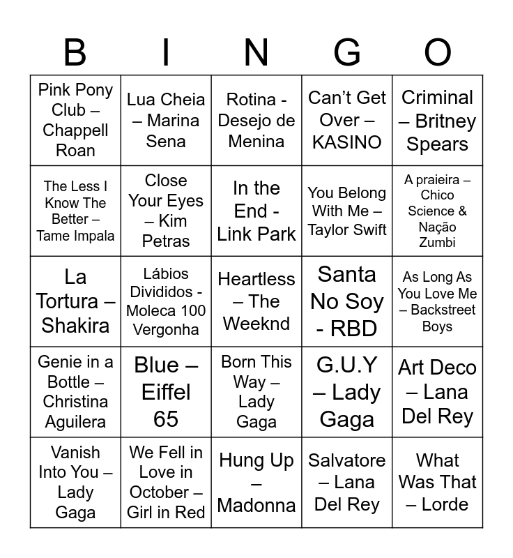 This bingo card has 71 words: Free!, Lua Cheia – Marina Sena, Another Day in Paradise – Phil Collins, 1999 – Charli xcx, Hung Up – Madonna, Garden of Eden – Lady Gaga, Can’t Get Over – KASINO, Cry For You – September, You Belong With Me – Taylor Swift, If U Seek Amy – Britney Spears, Vanish Into You – Lady Gaga, Mood Ring – Lorde, A praieira – Chico Science & Nação Zumbi, Pink Pony Club – Chappell Roan, Good Luck, Babe! – Chappell Roan, La Tortura – Shakira, G.U.Y – Lady Gaga, Criminal – Britney Spears, Vogue – Madonna, As Long As You Love Me – Backstreet Boys, Blue – Eiffel 65, Heartless – The Weeknd, Art Deco – Lana Del Rey, TOKITÔ – Marina Sena, Mama África – Chico César, Alejandro – Lady Gaga, Stereo Love – Edward Maya, Ragatanga – Rouge, Gimme! Gimme! Gimme! – ABBA, Teacher’s Pet – Melanie Martinez, We Fell in Love in October – Girl in Red, Maracatu Atômico – Chico Science & Nação Zumbi, So Hot You’re Hurting My Feelings – Caroline Polachek, Caribbean Blue – Enya, Salvatore – Lana Del Rey, Alibi – Pabllo Vittar, Can’t Remember to Forget You – Shakira feat. Rihanna, Mr. Saxobeat – Alexandra Stan, The Less I Know The Better – Tame Impala, Wildest Dreams – Taylor Swift, Born This Way – Lady Gaga, What Was That – Lorde, Genie in a Bottle – Christina Aguilera, Hallucinate – Dua Lipa, Milkshake – Kelis, Numa Ilha – Marina Sena, Venus – Lady Gaga, Close Your Eyes – Kim Petras, São Amores – Pabllo Vittar, Cry Me a River - Justin Timberlake, Salt - Ava Max, Apple - Charlie xcx, Santa No Soy - RBD, Beautiful Crime - Tamer, Wicked Games - Chris Isaak, Careless Whisper - George Michael, In the End - Link Park, The Rhythm of the Night - Corona, Voyage Voyage - Desireless, Give Me All Your Luvin' - Madonna feat. M.I.A. and Nicki Minaj, One Of Your Girls - Troye Sivan, Aonde Está Você - Forrozão Tropikalia, Lábios Divididos - Moleca 100 Vergonha, Planeta de Cores - Forrozão Tropykália, Verdadeiro Amor - Magnificos, Evermore - Taylor Swift, Rotina - Desejo de Menina, O Descobridor Dos Sete Mares - Tim Maia, Acenda o Farol - Tim Maia, Sangue Latino - Secos e Molhados and Chove Chuva - Jorge Ben Jor.