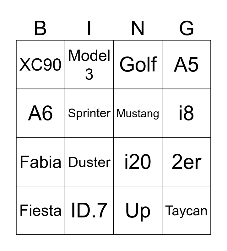 This bingo card has 16 words: ID.7, 2er, Golf, XC90, Fabia, Model 3, i20, Up, A6, Sprinter, Fiesta, A5, Duster, i8, Mustang and Taycan.