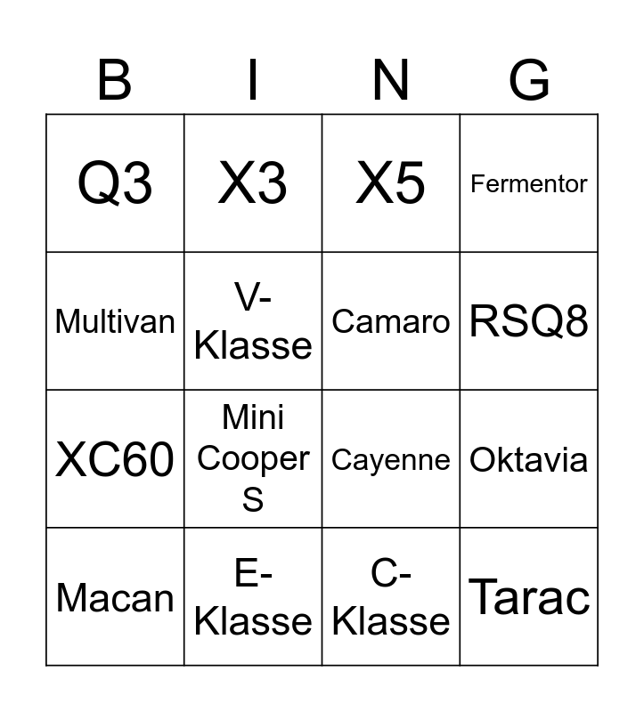 This bingo card has 16 words: E-Klasse, Oktavia, X5, Q3, XC60, X3, Cayenne, C-Klasse, Multivan, V-Klasse, Macan, Fermentor, Mini Cooper S, RSQ8, Camaro and Tarac.
