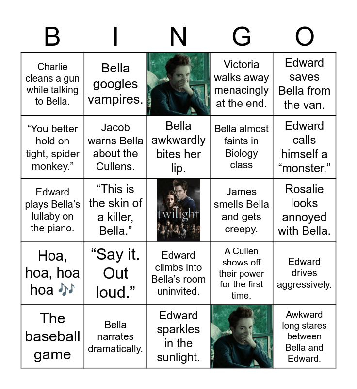 This bingo card has 2 images, a free space and 23 words: “Say it. Out loud.”, Edward sparkles in the sunlight., Bella awkwardly bites her lip., The baseball game, Edward saves Bella from the van., Charlie cleans a gun while talking to Bella., “You better hold on tight, spider monkey.”, Bella googles vampires., James smells Bella and gets creepy., Edward climbs into Bella’s room uninvited., Bella almost faints in Biology class, Edward plays Bella’s lullaby on the piano., A Cullen shows off their power for the first time., Edward drives aggressively., Jacob warns Bella about the Cullens., The Cullen family cooks food for Bella., Rosalie looks annoyed with Bella., Edward calls himself a “monster.”, “This is the skin of a killer, Bella.”, Awkward long stares between Bella and Edward., Bella narrates dramatically., Hoa, hoa, hoa hoa 🎶 and Victoria walks away menacingly at the end..