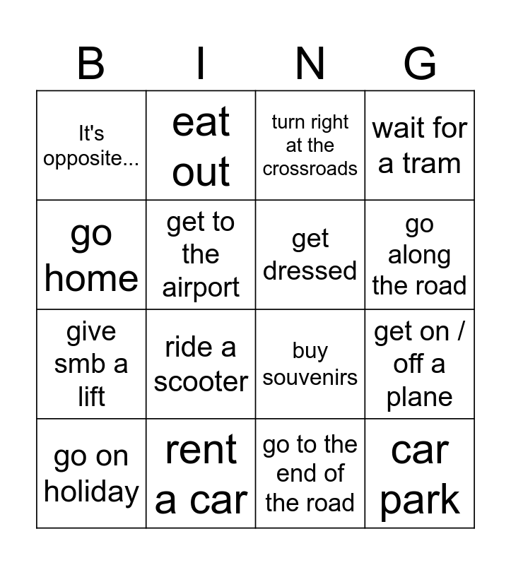 This bingo card has 16 words: rent a car, get on / off a plane, turn right at the crossroads, It's opposite..., give smb a lift, eat out, buy souvenirs, go to the end of the road, go home, get to the airport, go on holiday, wait for a tram, ride a scooter, go along the road, get dressed and car park.