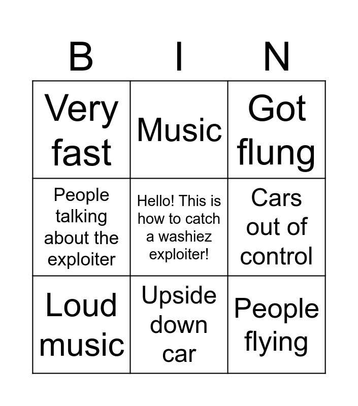 This bingo card has a free space and 8 words: Cars out of control, Got flung, Music, Loud music, Very fast, People flying, People talking about the exploiter and Upside down car.
